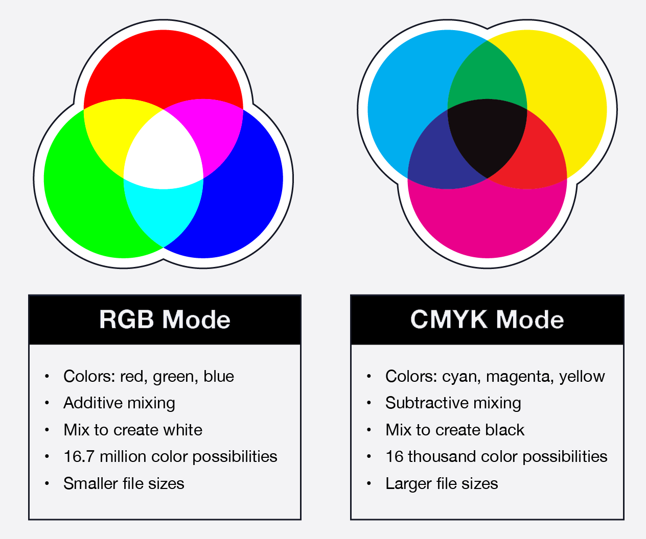 RGB has a wider, more vibrant gamut, while CMYK is optimized for physical production (printing)